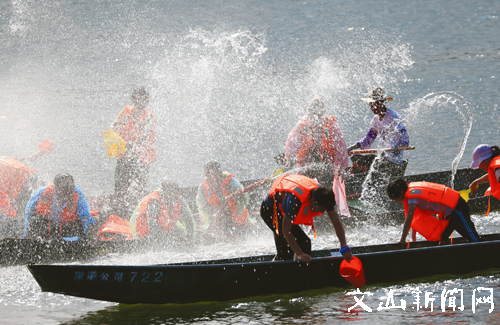 8月3日,在云南文山壮族苗族自治州丘北县普者黑景区,游客体验打水仗,感受清凉。 高温天气,山清水秀、清凉宜人的丘北县普者黑景区成为游人避暑的好去处。 【新华社发钟敏 摄】