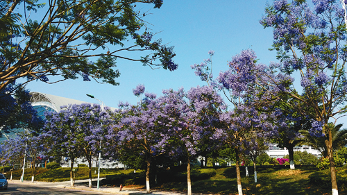 文网讯 又是一年春夏之交,文山城人行道两旁,体育城、七花广场等地,一棵棵高大的蓝紫楹树,开满美艳的花朵,远远看去就像一团团紫云飘在空中,如烟如雾,美不胜收。蓝紫楹的树冠高大,树形婆娑雅致,叶似凤凰羽扇,紧密生长。开蓝色花儿的植物本来就少,高大乔木开这种颜色的花就更让人惊艳了。是它,给文山城的街道覆盖了一层朦胧的神秘感,夕阳下、晨曦中,随风飞舞的花瓣与地上蓝莹莹的“花毯”,更是唯美。...