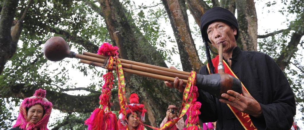 据当地村民介绍,除“荞菜节”外,每年农历正月初一至初三、正月十五这几天,花倮人都要跳葫芦笙舞。舞蹈共分七路,每一路都有不同的葫芦笙曲调吹奏,音乐较为丰富。舞蹈的特点是:一拍一次的膝部屈伸来带动腰肢、胸部和下颚部,呈“S”形前后自然曲动,节奏缓慢,动作有一种下垂感。而花倮人服饰以花、黑为主体色调。妇女上身穿较短的无领襟衣,用多种颜色布料裁剪成三角形小块拼合缝制,同时绣有鸟嘴、鸟眼睛、鸟脚等花纹图案。下着裙子为黑色齐脚踝长筒裙,后腰部系上三角形布块和红绒线泡缨制成的飘带,远观似凤凰尾。